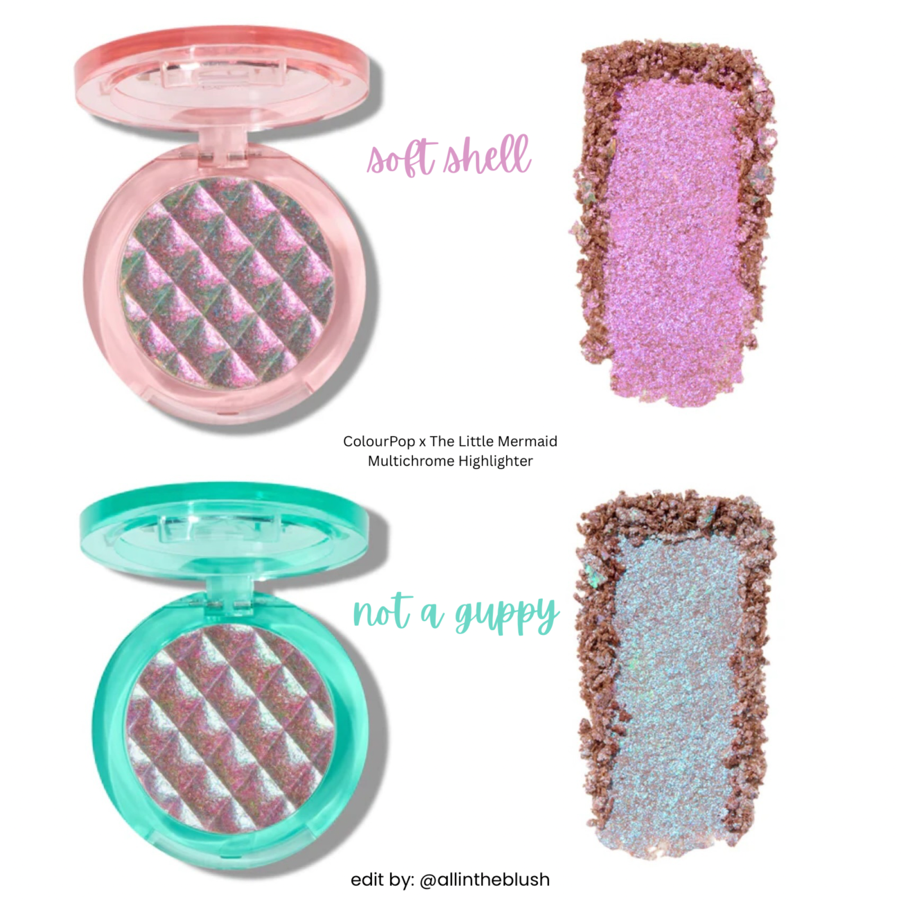 Featuring a mermaid scale pressed design, these multi-chrome highlighters feature a buttery-soft formula that glides on smoothly and builds easily for a magical glow that shifts with every angle of light. The shades include: not a guppy (a violet-green-silvery aqua inspired by Flounder), and soft shell (a pink-violet-copper inspired by Sebastian!)